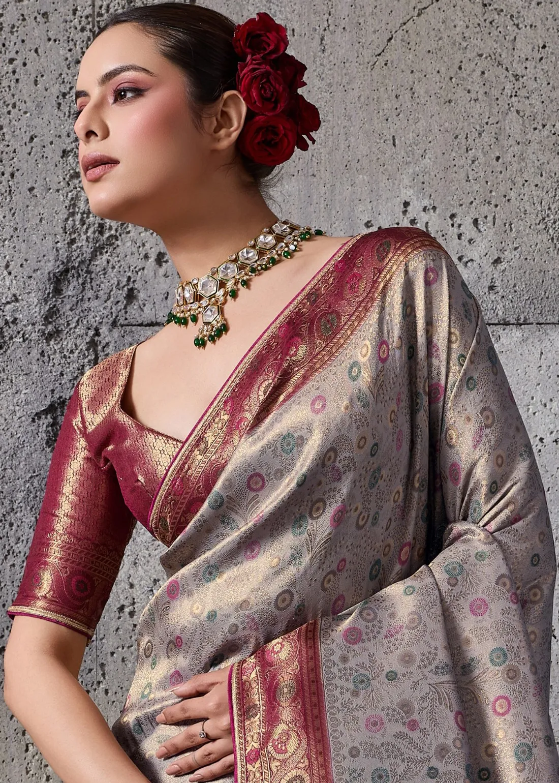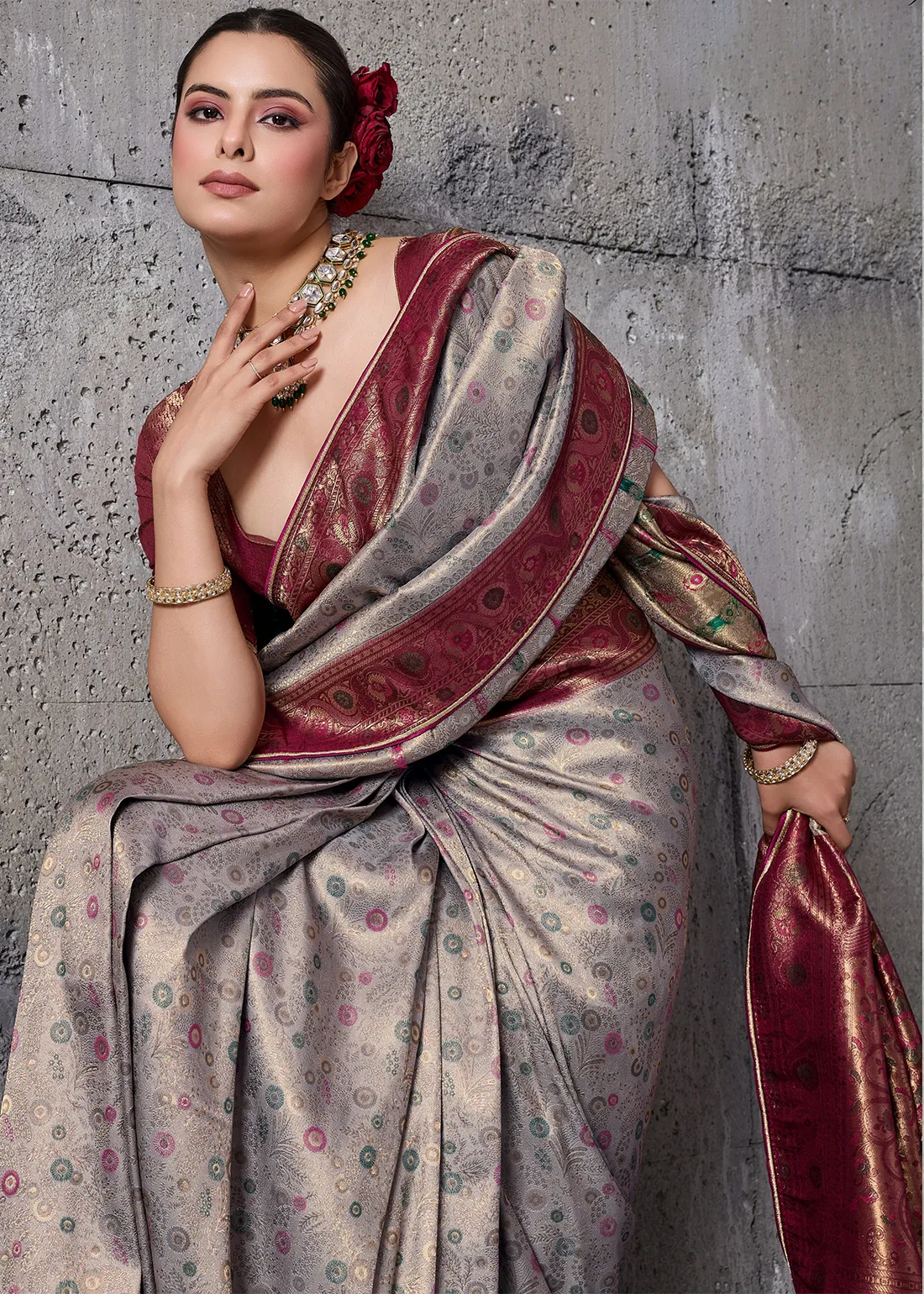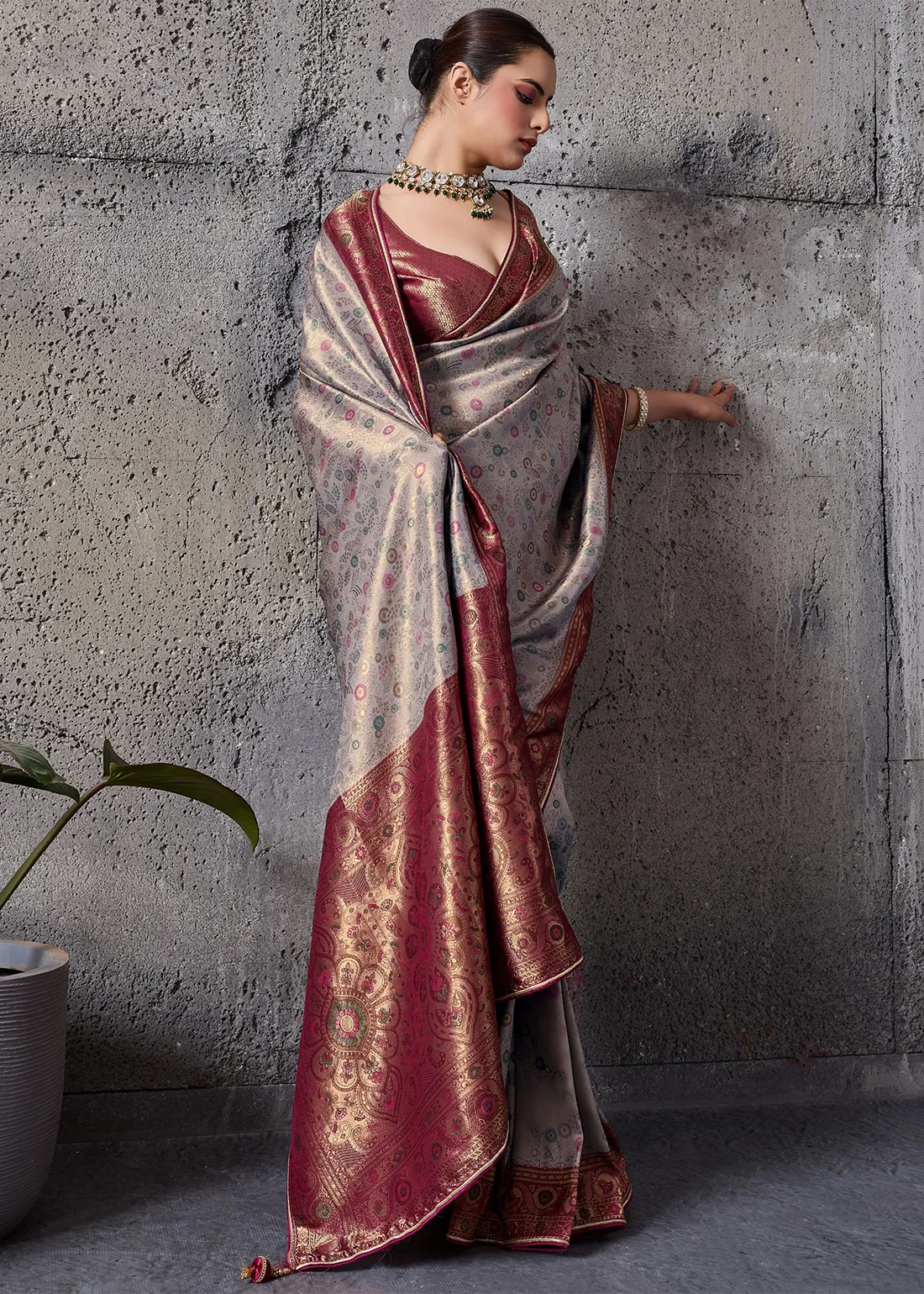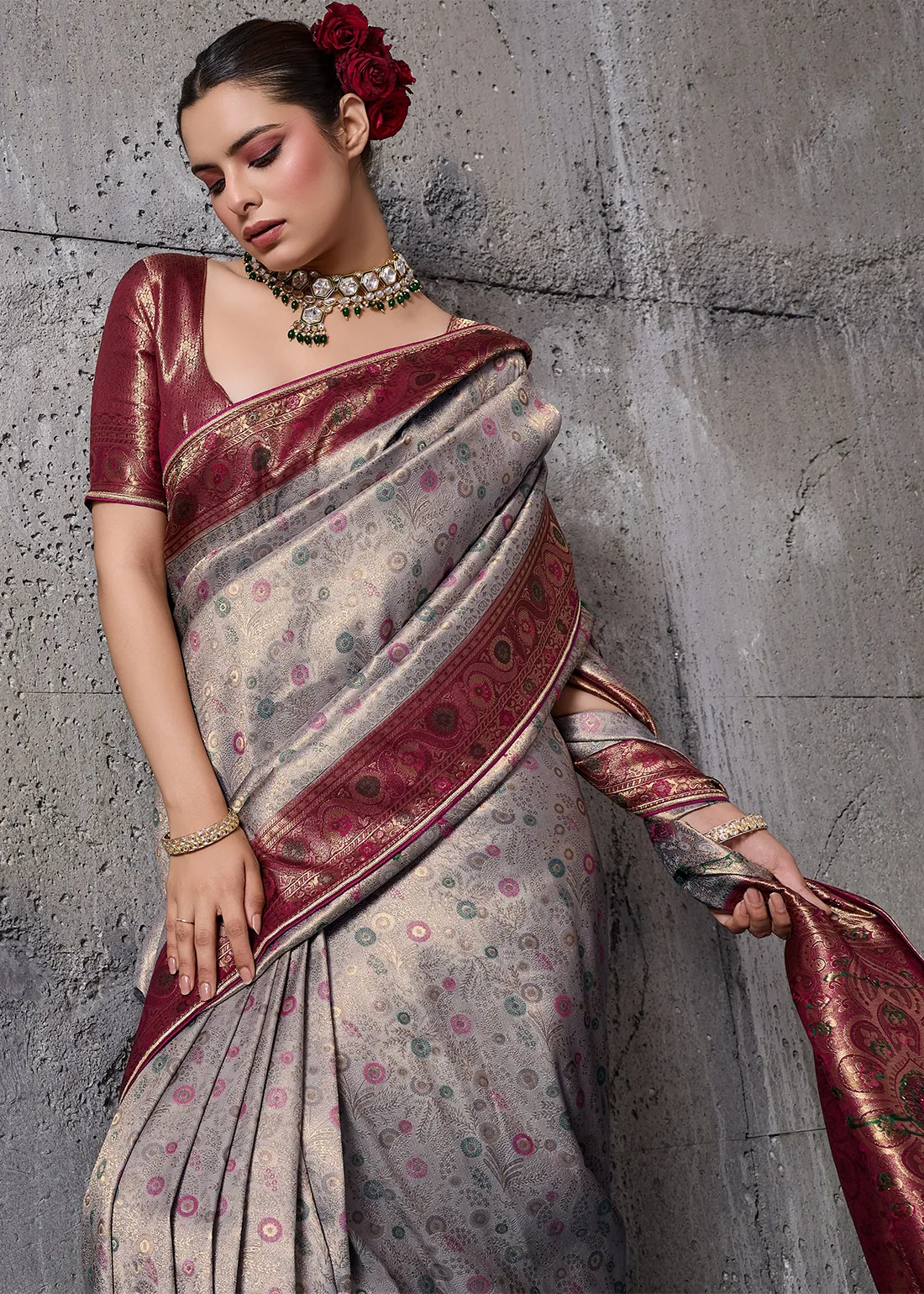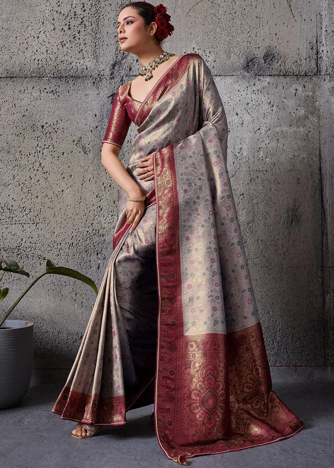 Embroidered Grey Kanjivaram Silk Saree with Maroon Blouse
