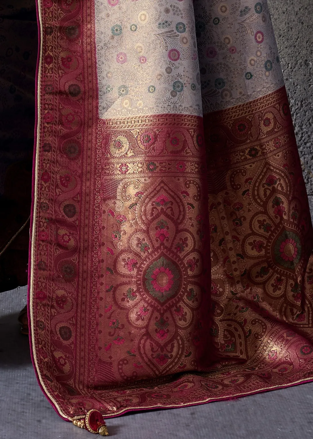 Saree: Step into effortless elegance with this stunning Silver Grey Kanjivaram Silk Saree. The luminous, metallic grey base is intricately woven with delicate, multi-coloured circular motifs, providing a beautifully modern touch to traditional craftsmanship. This is perfectly balanced by a rich, striking Maroon contrast border and a sweeping, grand pallu. Designed for a flawless drape, the saree edges are finished with premium piping. The pallu is further enhanced with beautifully crafted handmade designer tassels, adding a final touch of regal charm. Perfect for evening receptions, festive galas, and elegant traditional events.