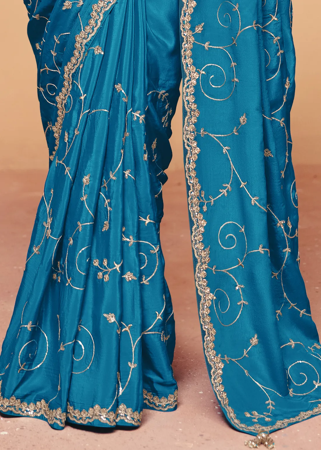 Saree: Make a vibrant statement with this breathtaking Teal Blue Embroidered Organza Saree. The sheer, lightweight drape of premium organza provides a bright, jewel-toned canvas beautifully framed by a heavy, intricately scalloped border. Hand-embellished with shimmering sequins, delicate stone detailing, and elegant trailing floral threadwork, this masterpiece perfectly balances traditional charm with modern glamour. It is the ultimate statement piece for festive celebrations, Mehendi ceremonies, and vibrant evening receptions.