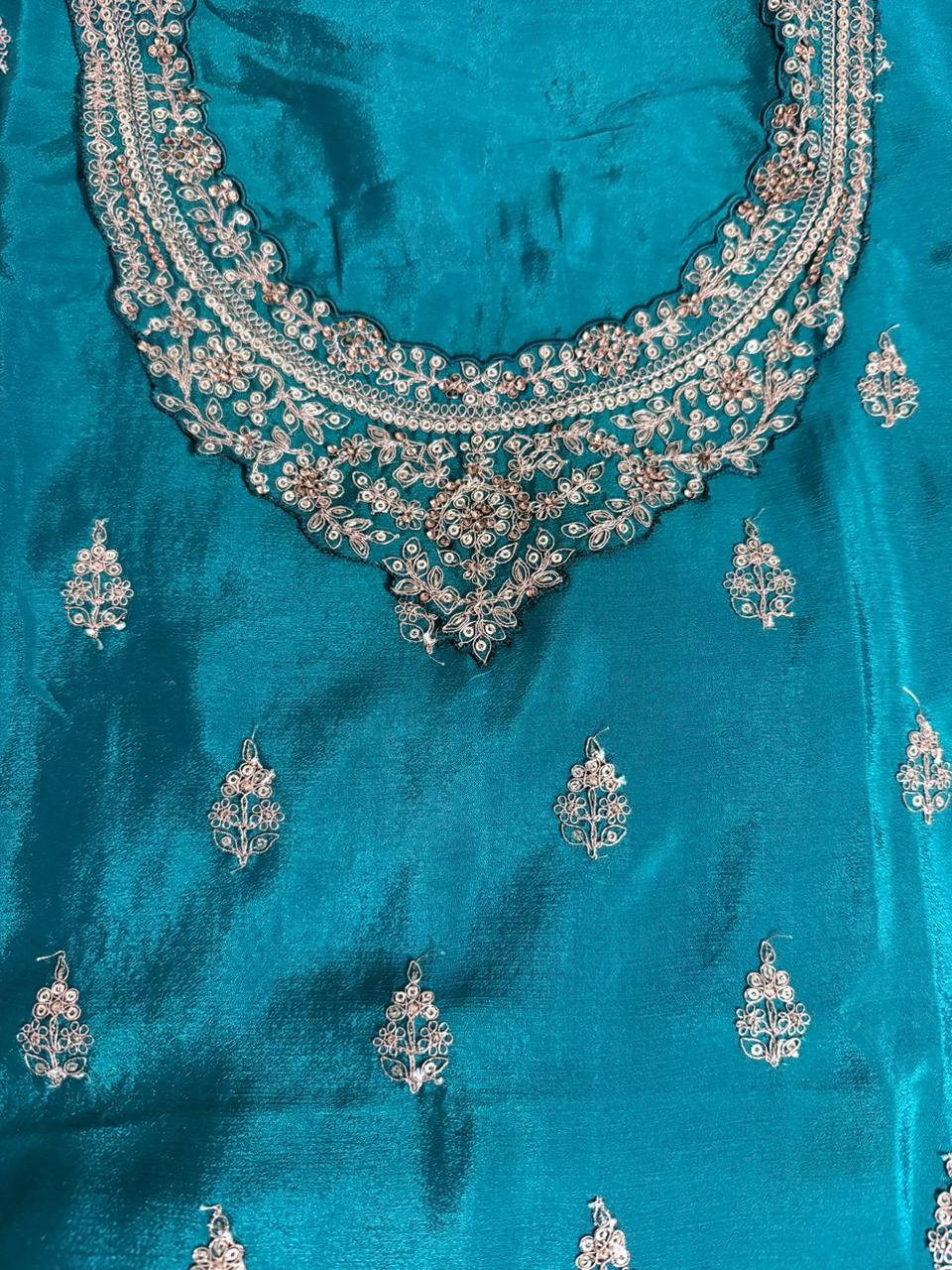 Make heads flip and charm everyone with your grace and beauty by opting for this gorgeous Teal Chinon Silk Sharara Suit adorned with heavy Zari Embroidery and Sequins work. Whether it’s a festive celebration, a wedding, or a cultural event, this gorgeous outfit is sure to make a lasting impression.
