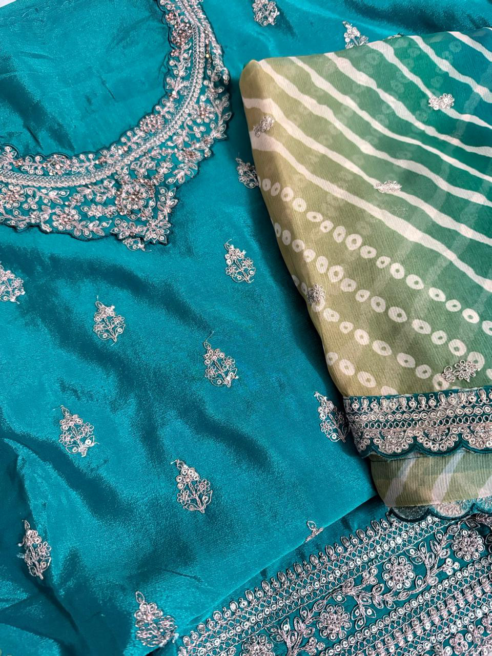 Teal Chinon Silk Sharara Suit with Embroidery and Sequins Work
