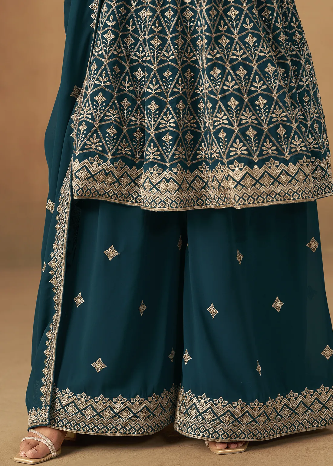 Make a graceful statement with this teal Georgette Palazzo Suit, designed with exquisite sequin and resham embroidery. The semi-stitched top is complemented by a free-size stitched palazzo bottom and an embroidered dupatta, adding an elegant finish. The santoon inner ensures comfort while keeping the look festive-ready. A perfect outfit for weddings, festive parties, and receptions.
