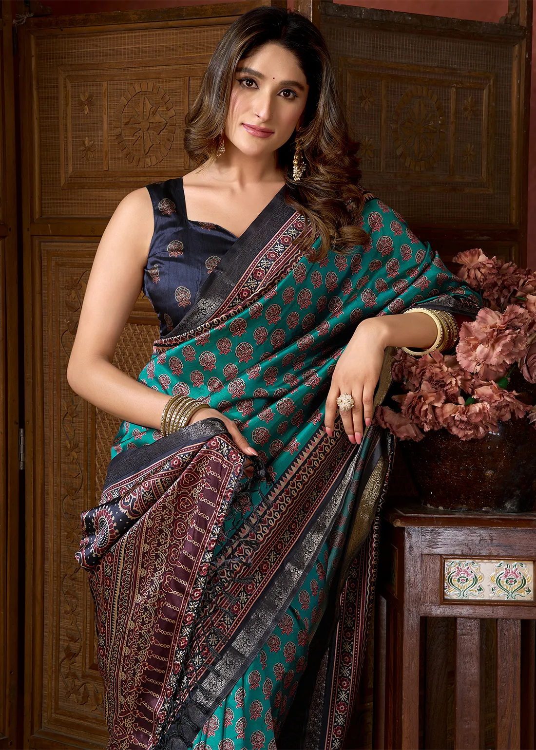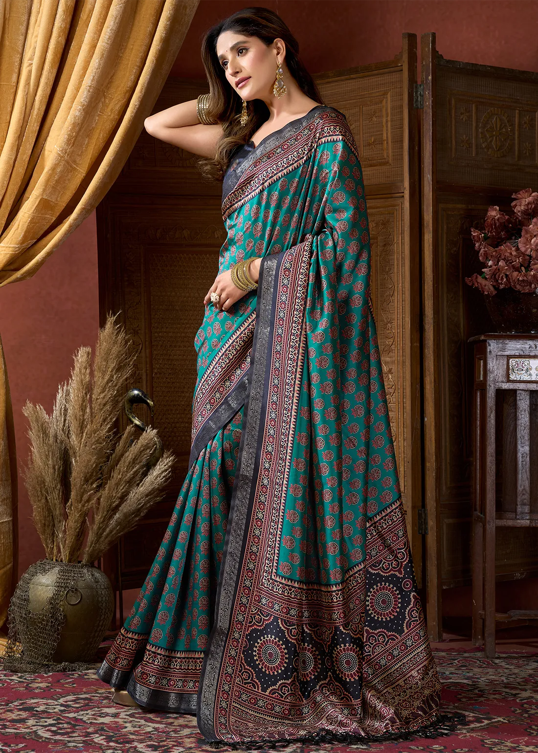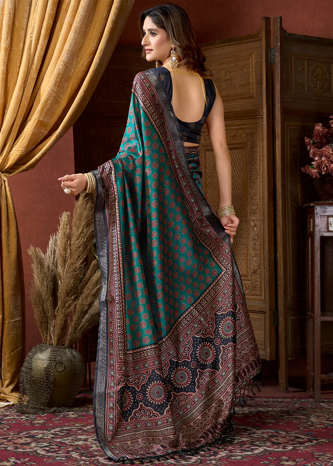 Rendered in rich teal and navy tones, the saree features intricate digitally printed Ajrakh motifs inspired by traditional craftsmanship. The fluid satin crepe fabric drapes effortlessly, offering a graceful fall and a soft, luxurious feel against the skin — perfect for long festive or formal occasions.