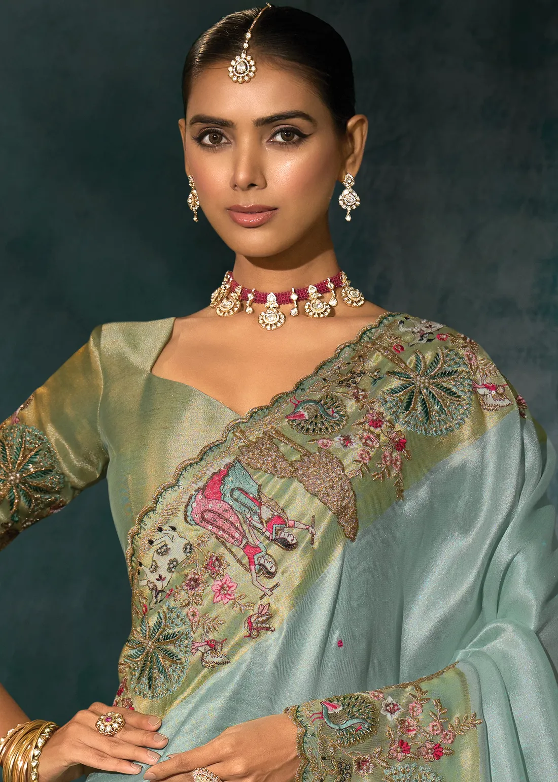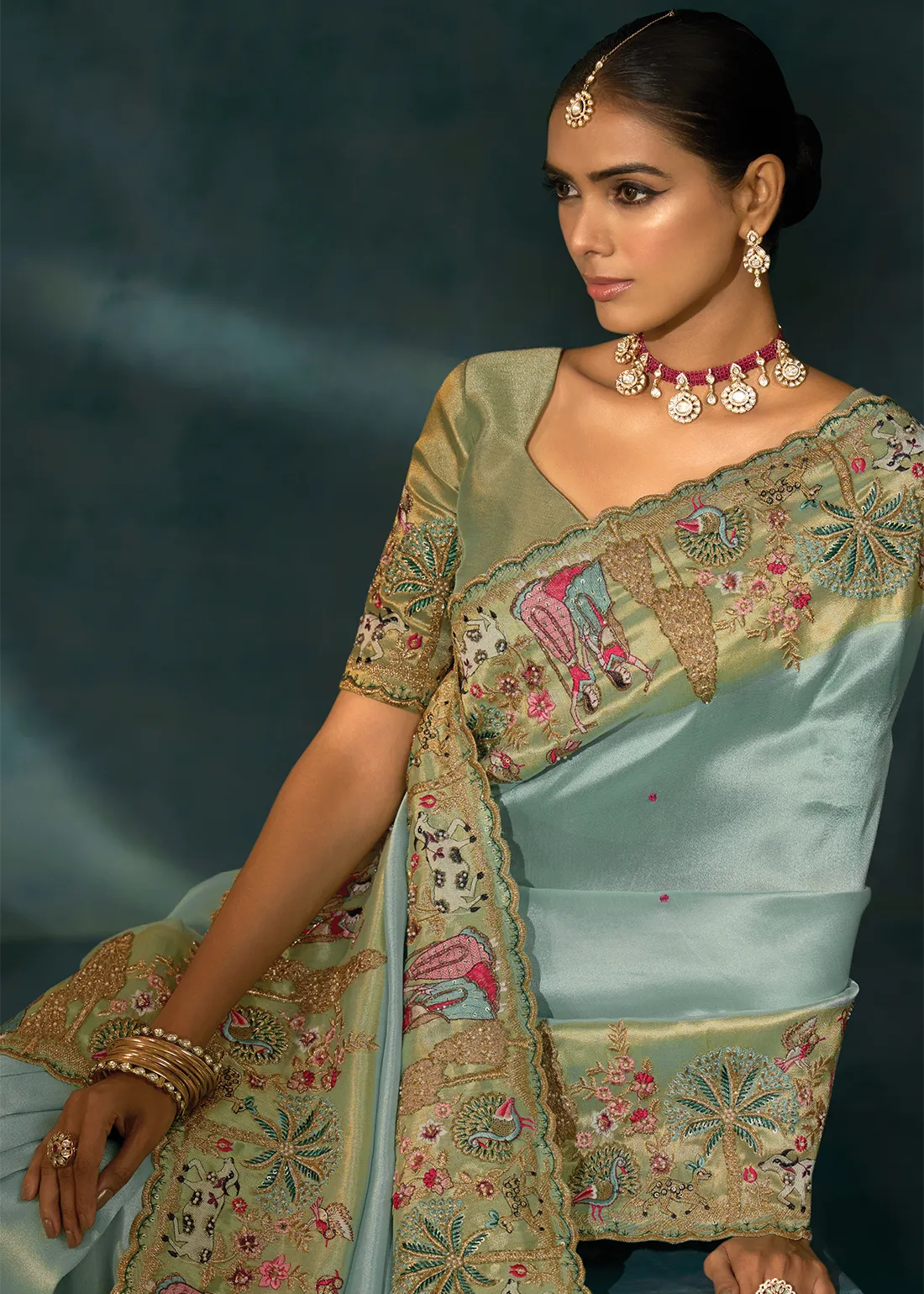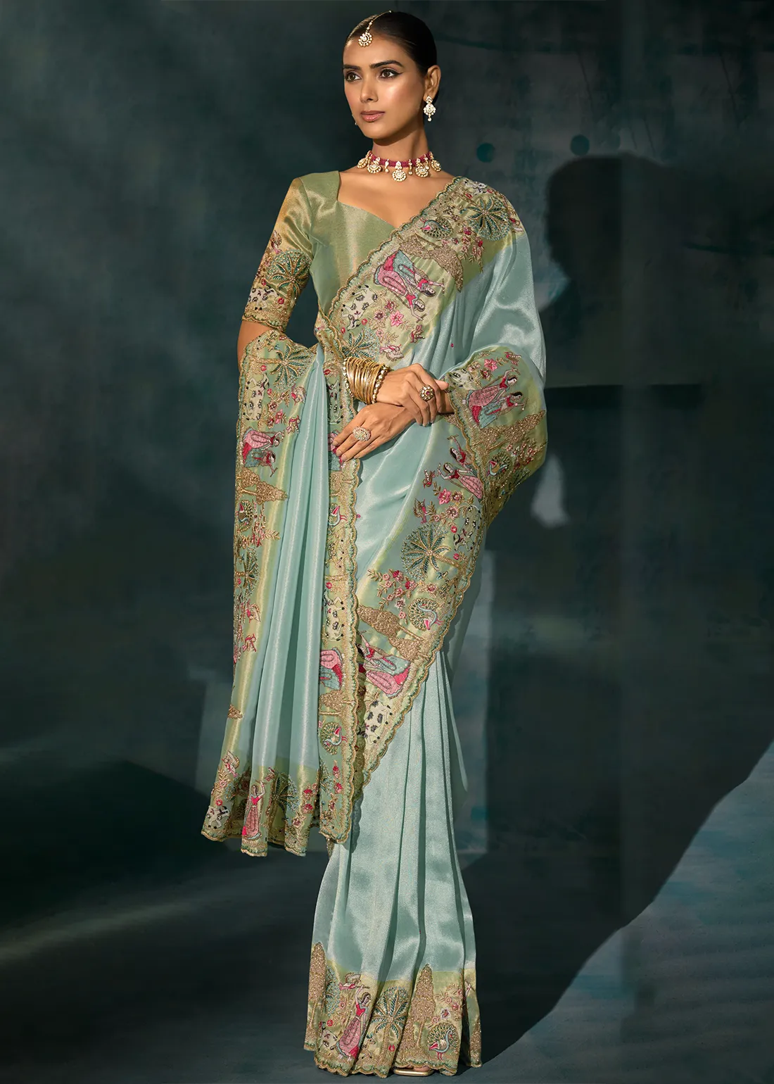 Turquoise Banarasi Saree with Handwork and Embroidered Blouse