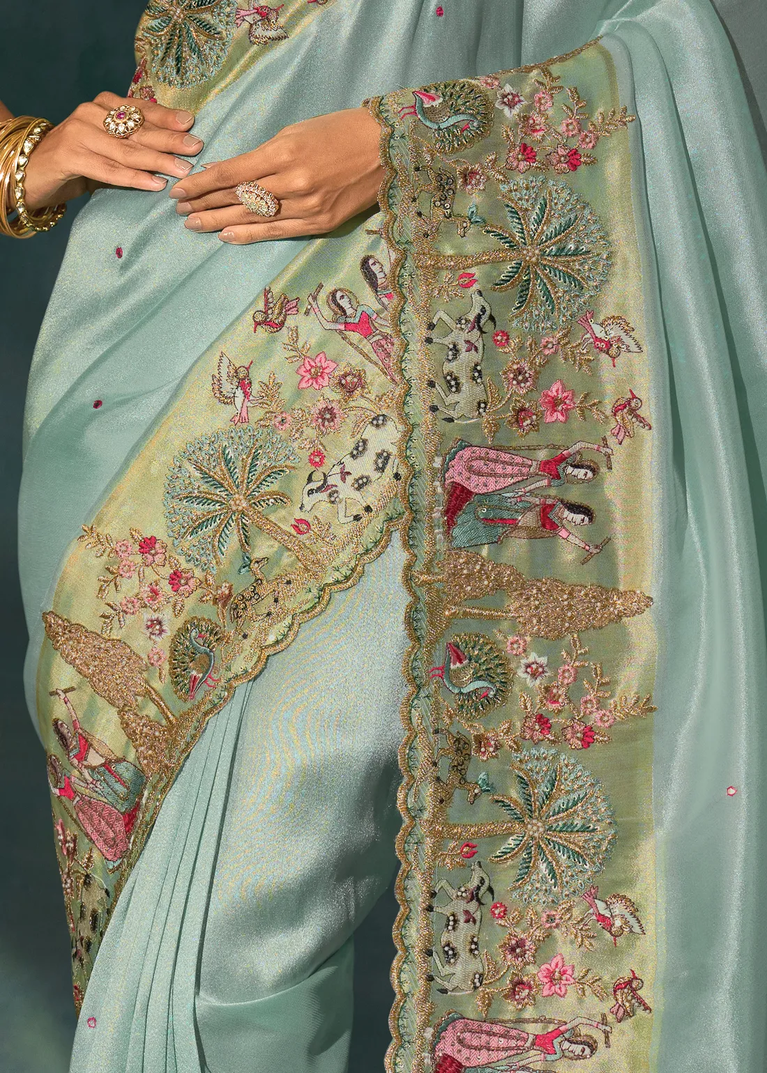 Turquoise Embroidered Silk Saree with Scalloped Border