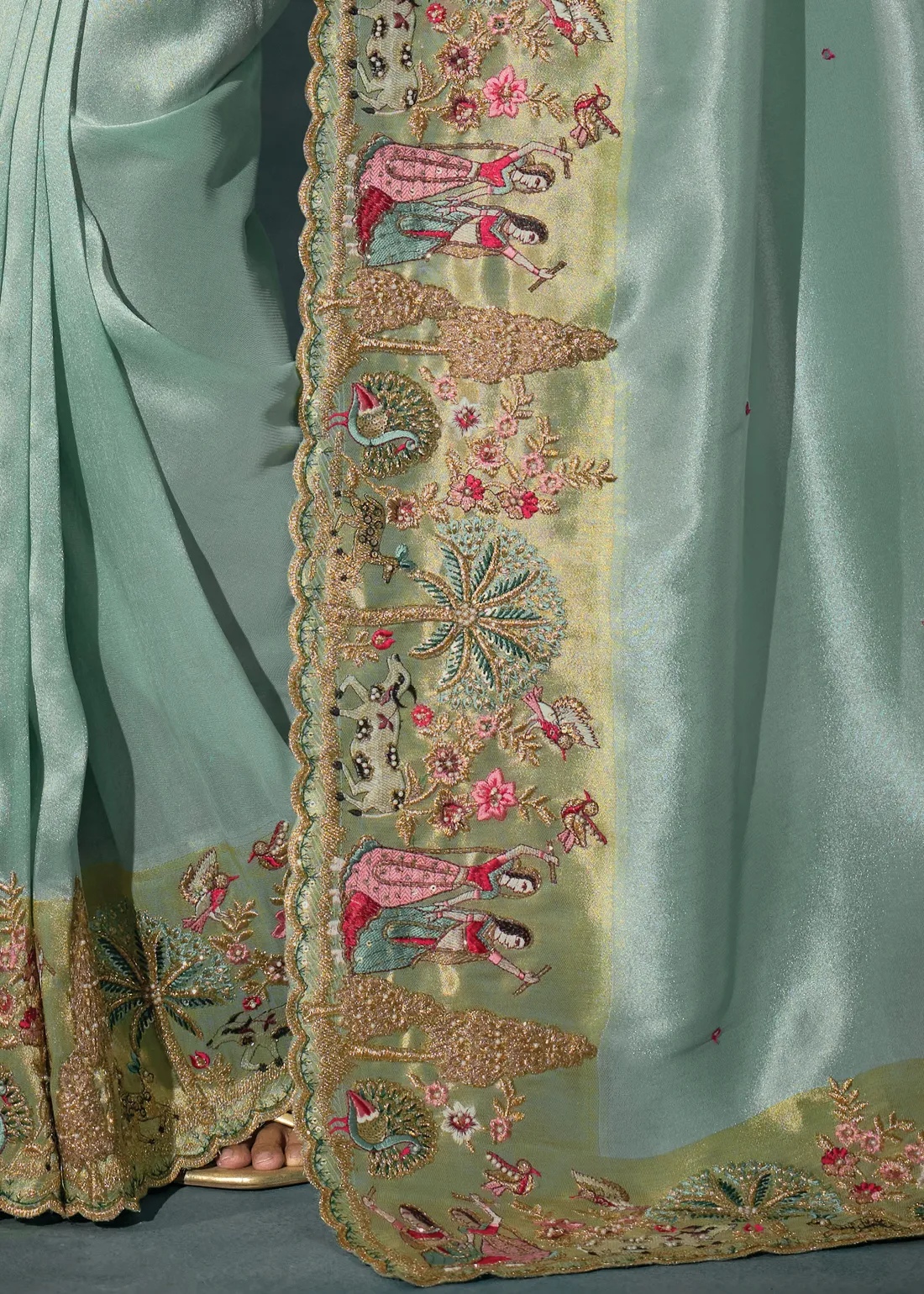 Step into timeless luxury with this exquisite Turquoise Luxe Silk Saree, a masterpiece crafted for modern brides and women who adore heritage elegance. Made from premium fabric, this saree features a breathtaking border adorned with intricate Zari, Thread, Cutdana, Mirror, and Beads work, showcasing royal motifs, floral artistry, and delicate scene-inspired embroidery.