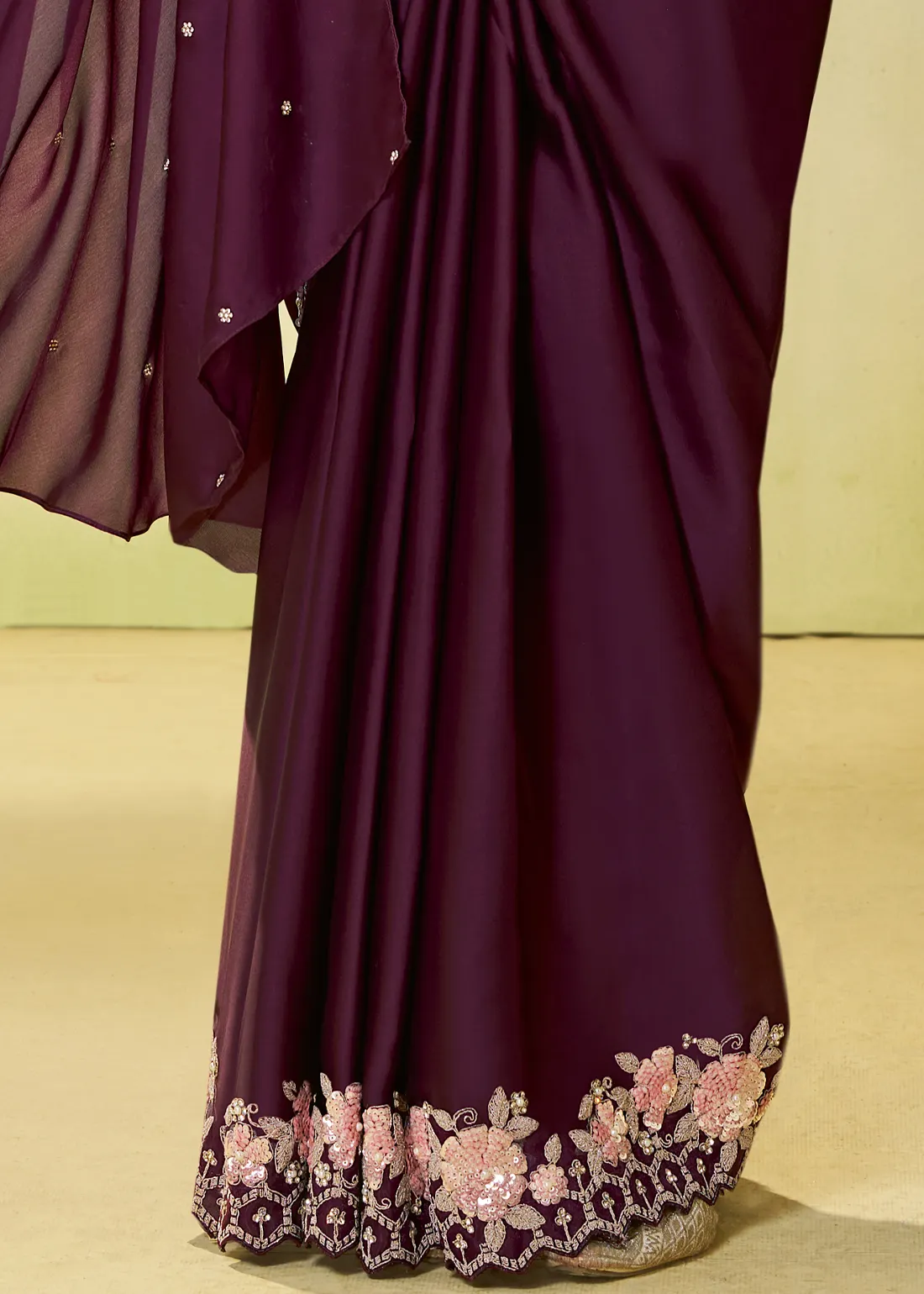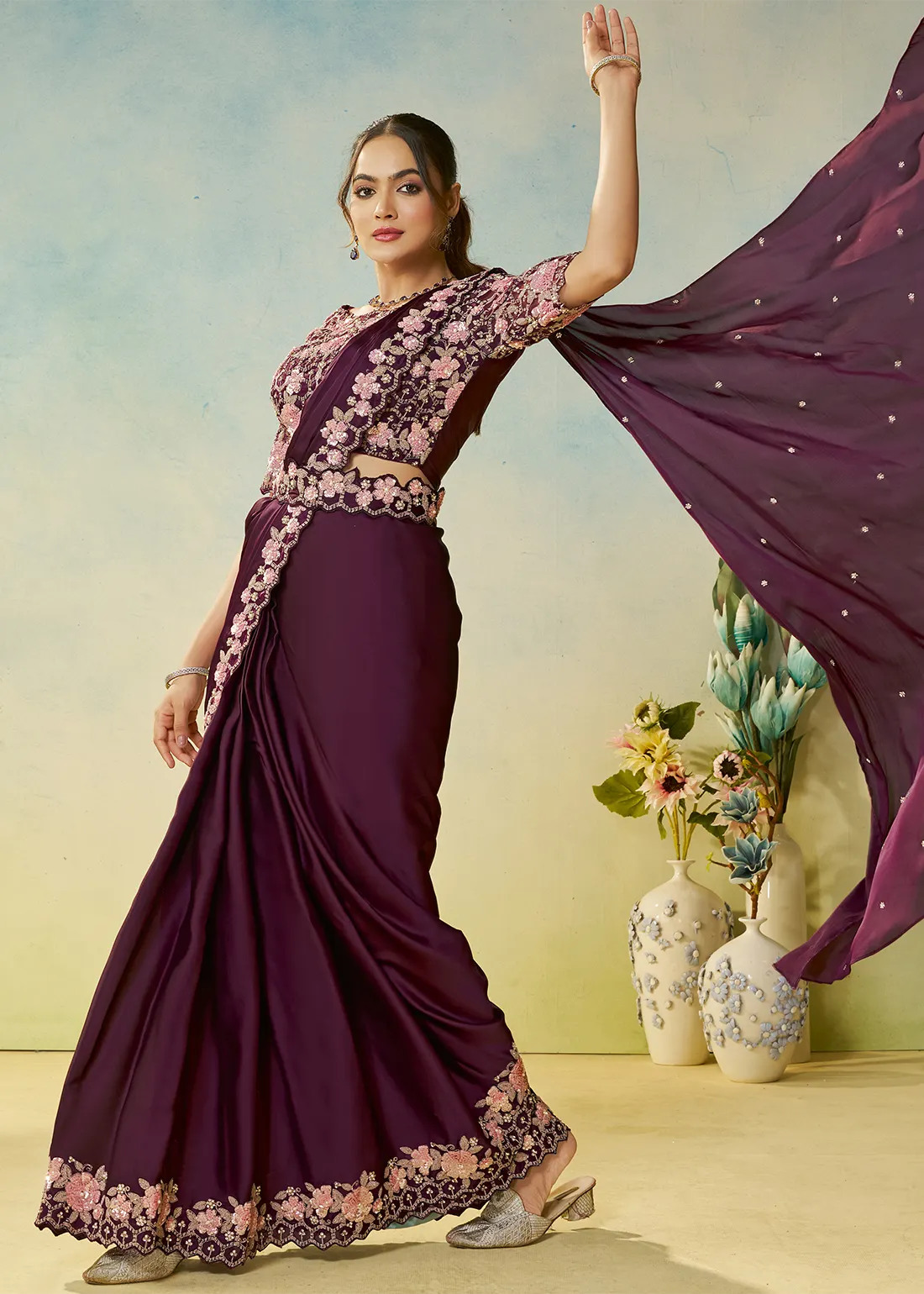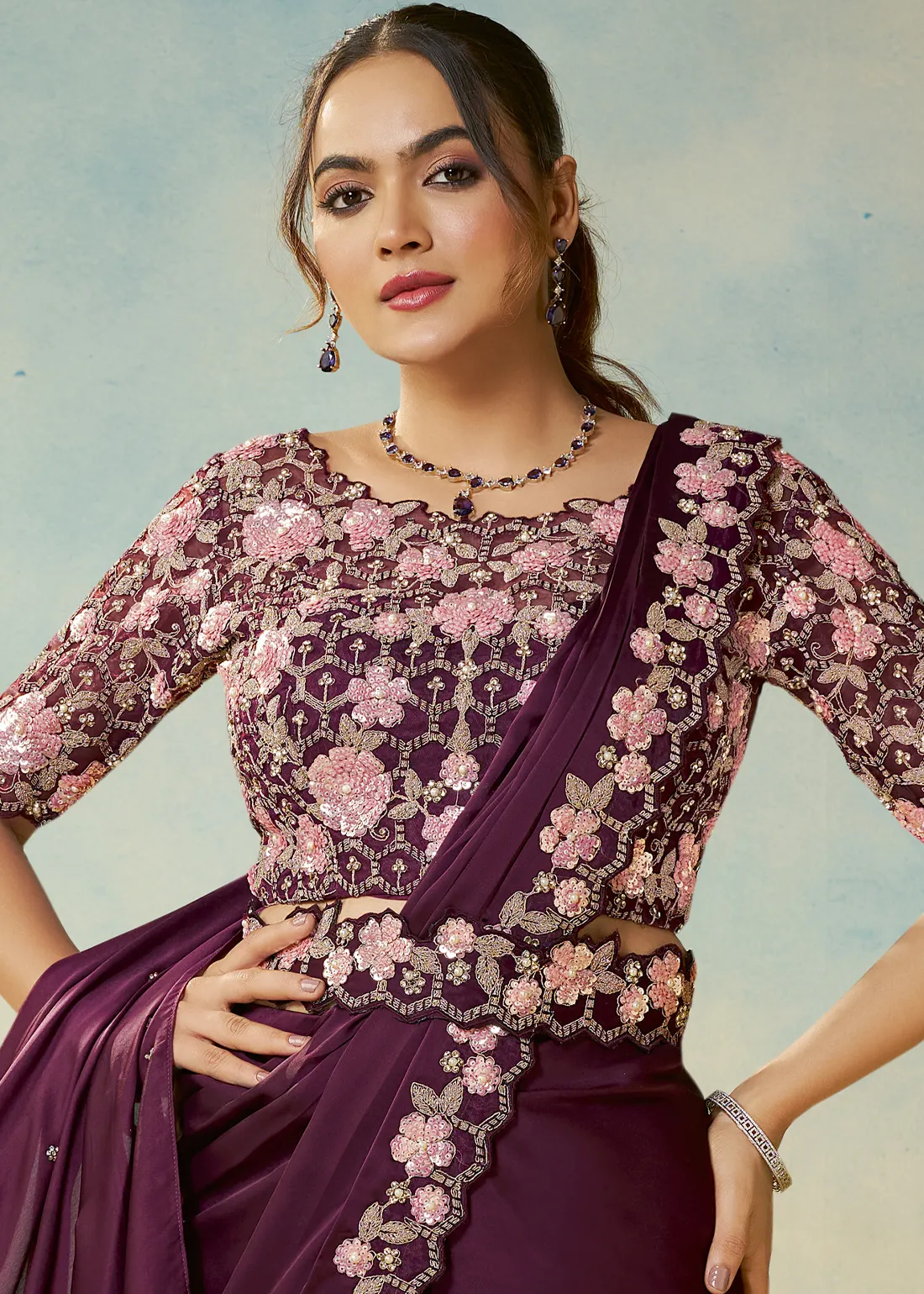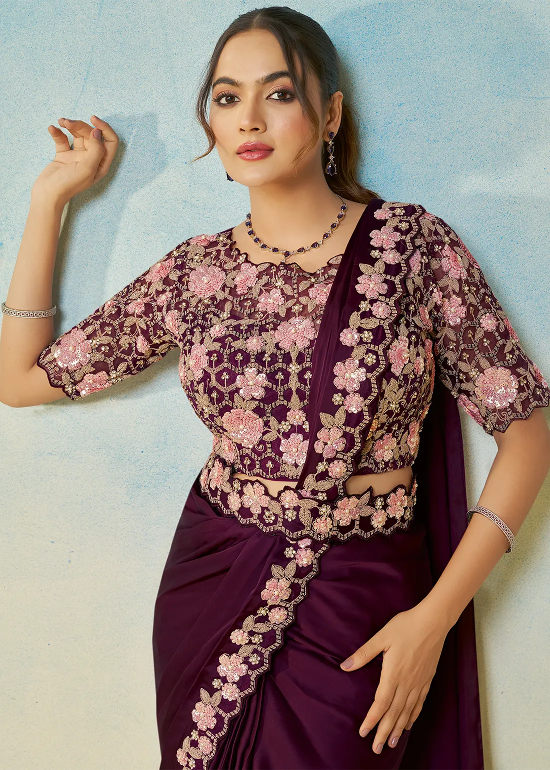 Saree: Embrace timeless elegance with this Wine Ready to Wear Designer Saree featuring Resham, Cording and Sequins embroidery work along with beautiful Stone and Beads handwork that adds a unique touch of craftsmanship to the saree. This beautifully crafted drape has a luxurious and royal appeal and looks captivating when worn. Whether you’re attending a wedding, a party, or any other grand event, this Designer Saree promises to turn heads and make you a vision of grace and sophisticated beauty.