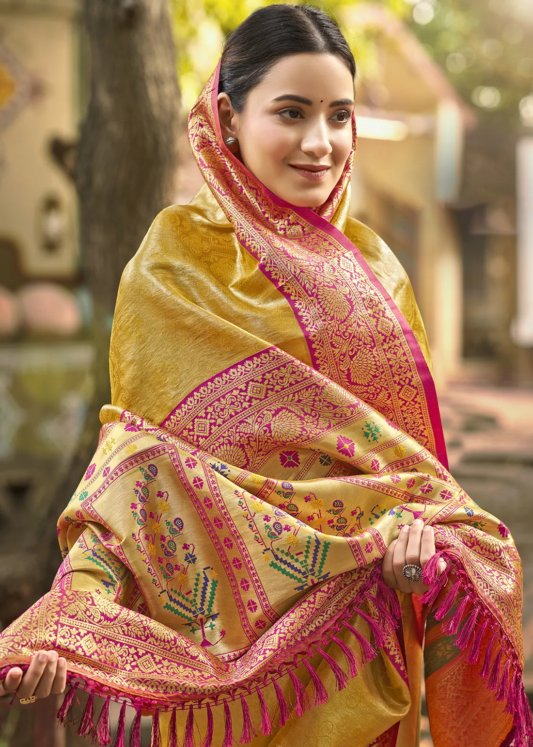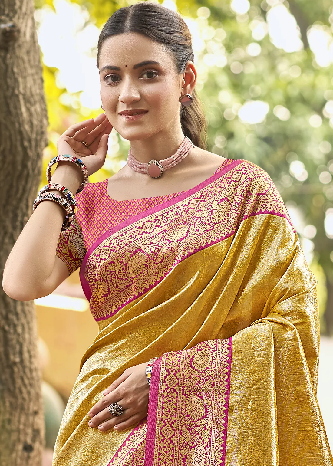 Mustard Yellow & Pink Kanjivaram Silk Saree with Meenakari