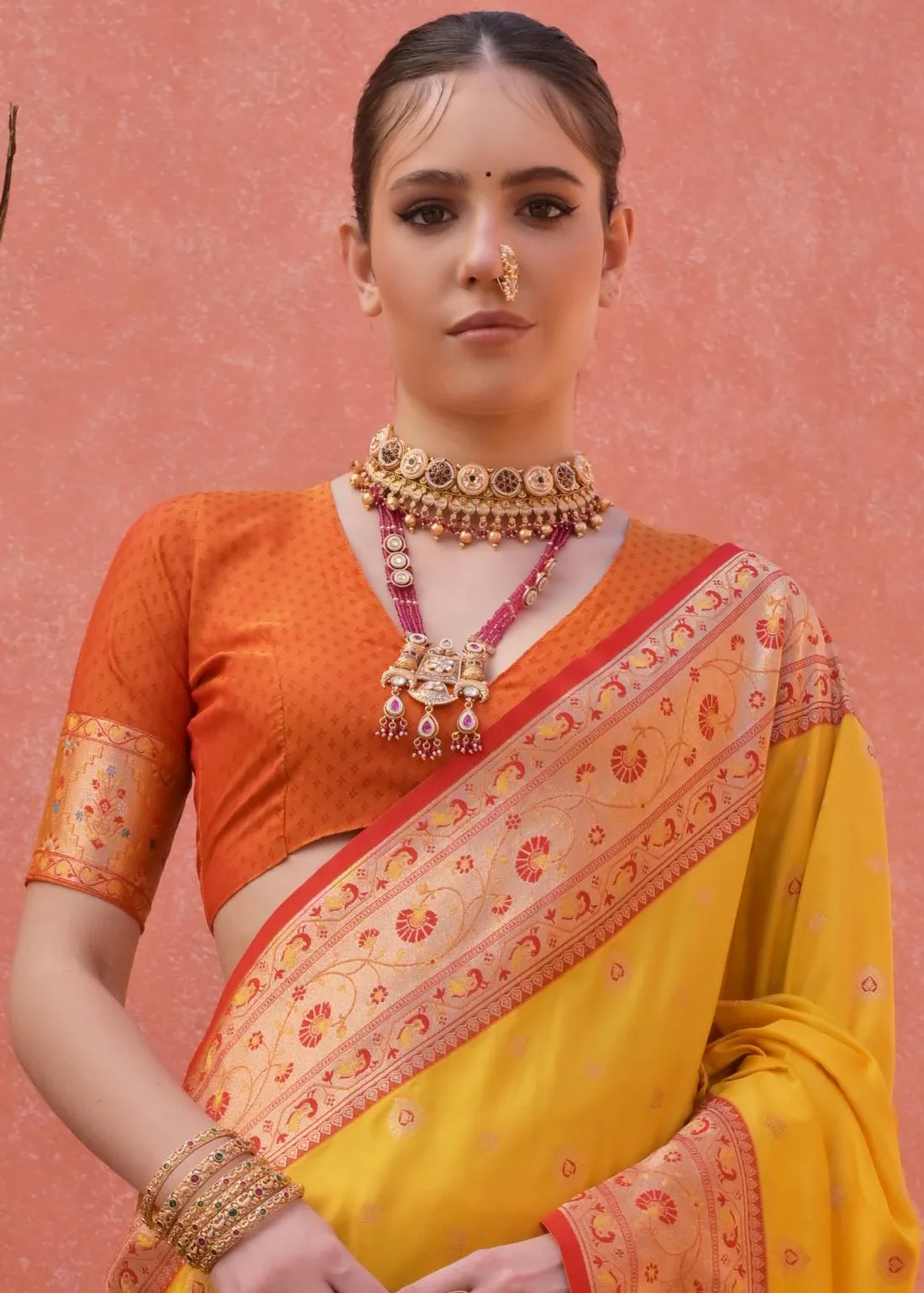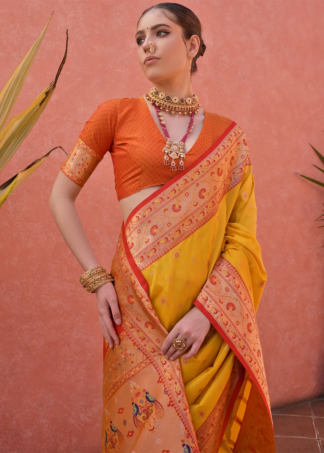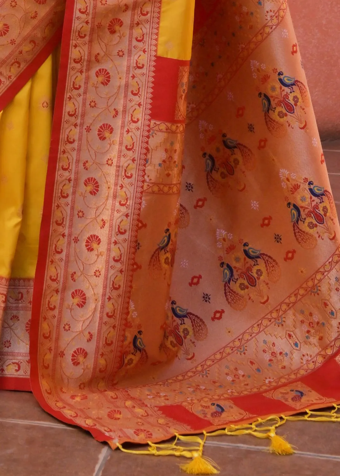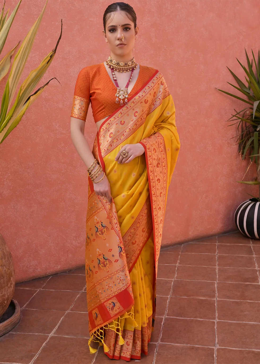 ■ This exquisite Yellow Paithani Silk Saree is a timeless masterpiece crafted with unwavering devotion and love.